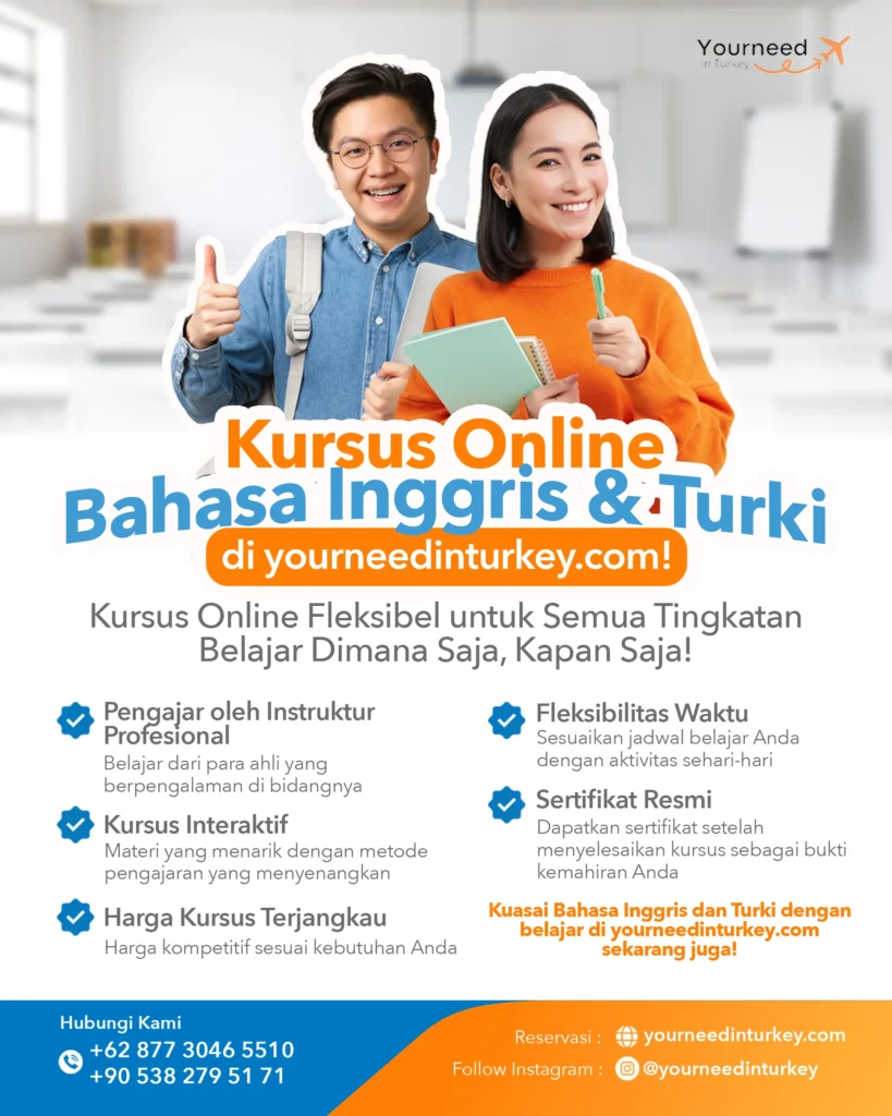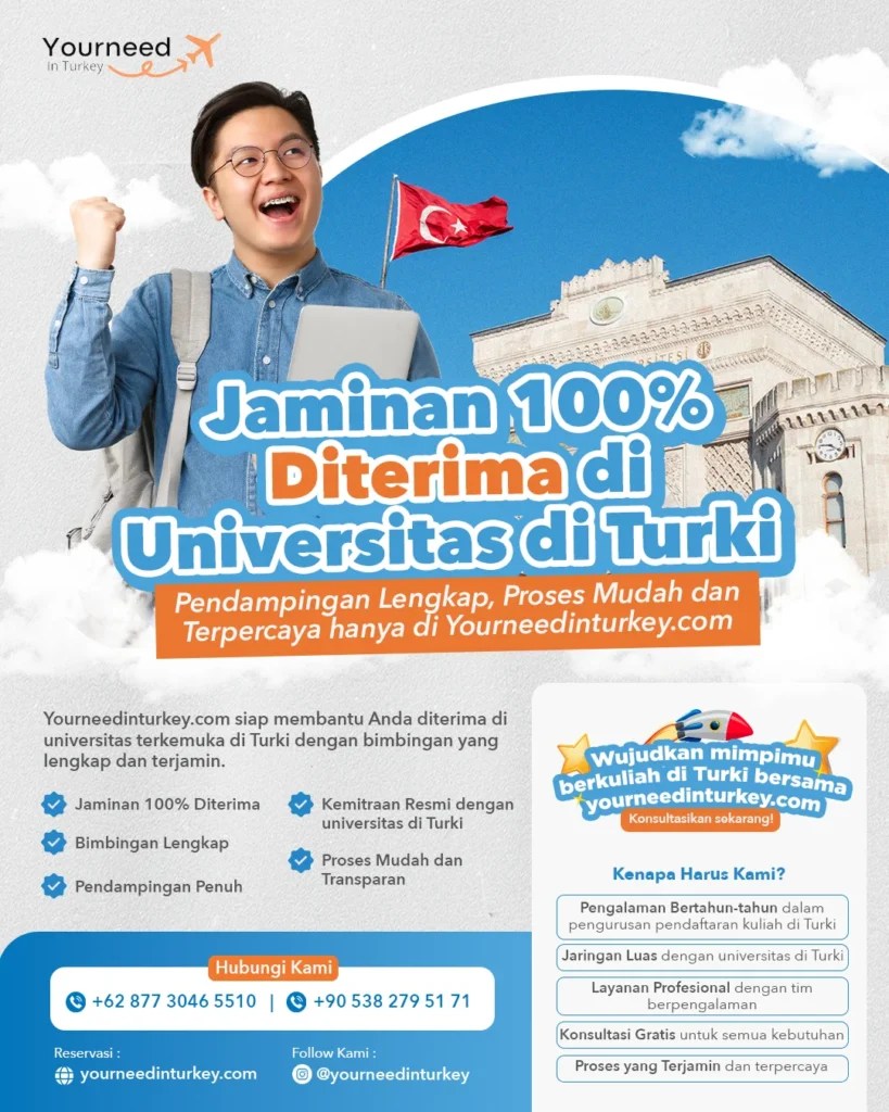 Ingin kuliah di Turki dan meraih pengalaman internasional? YourNeedInTurkey.com siap membantu! Layanan Study in Turkey kami menawarkan bimbingan lengkap—mulai dari pemilihan jurusan, pengurusan dokumen, hingga adaptasi. Dengan jaminan 100% diterima, kami hadir untuk mempermudah perjalanan akademik Anda.